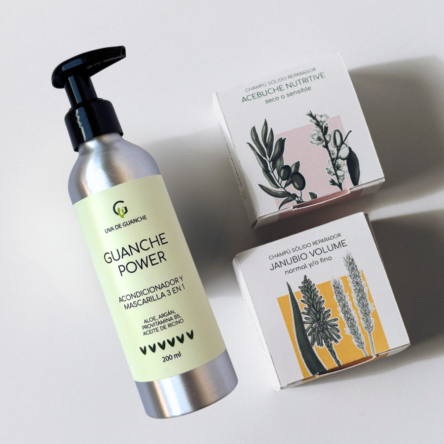 Con el Pack Pareja te llevas 2 champús sólidos reparados a elección y 1 Marcarilla-Acondicionadora 3 en 1  Guanche Power de 200 ml en botella dosificadora.